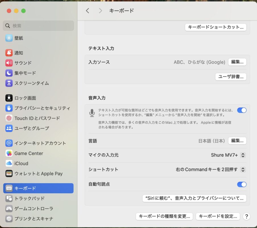 僕は普段MacBook Proで記事を書く事が多いので、音声入力の設定項目で右のコマンドボタンを2回押すと音声入力を起動する設定にしてあります。